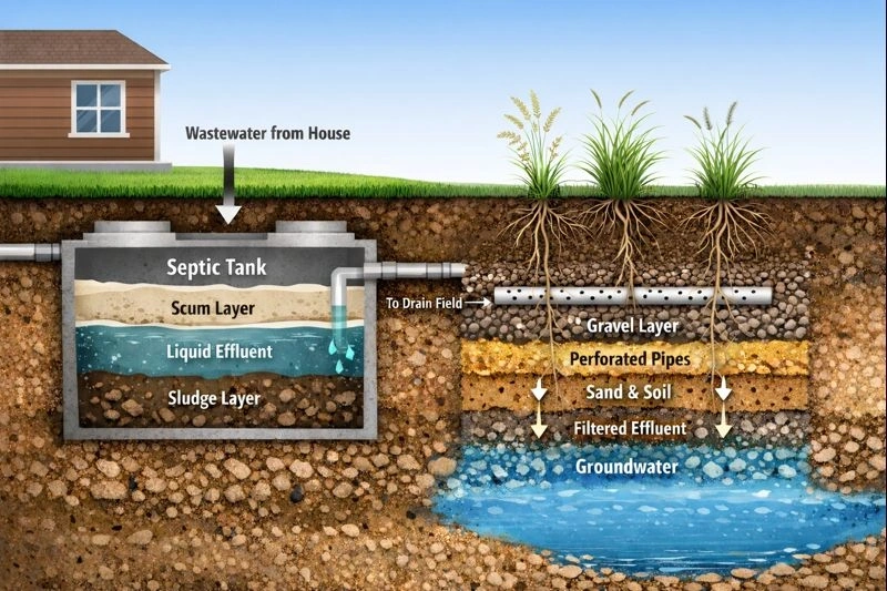 The drain field allows wastewater to be naturally filtered through soil, removing harmful bacteria, nutrients, and contaminants before the water reaches groundwater sources.